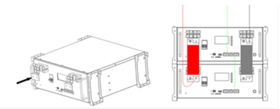 4 : Lock the aluminum sheet on the positive and negative output terminals of the battery pack, use the long aluminum sheet to connect the battery packs in parallel. Lock the P+ P- output cable and insert the parallel communication cable and the inverter communication cable, press the ON/OFF switch to turn on the system. Turn on the DC switch as below figure.