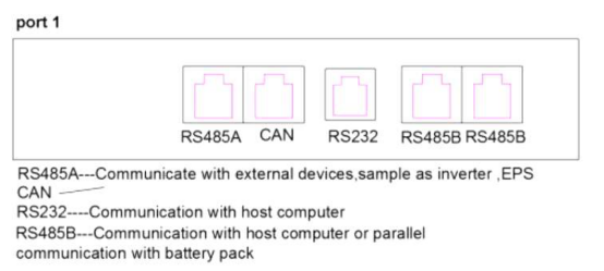 6. Connect the wiring of the pack as show below. If inverter need CANBUS port / RS485 port, please insert communication cable ( RJ45 ) to CAN port or RS485A, RS485B only be used for battery packs parallel mode.